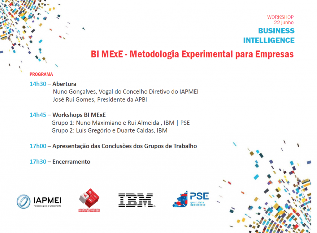 A Associação Portuguesa de Business Intelligence agradece a participação na 4ª edição do workshop “BI MExE – Metodologia Experimental para Empresas” realizado no dia 22 de junho na zona norte de Portugal, em parceria com o Iapmei – Agência para a Competitividade e Inovação, PSE e IBM Portugal.